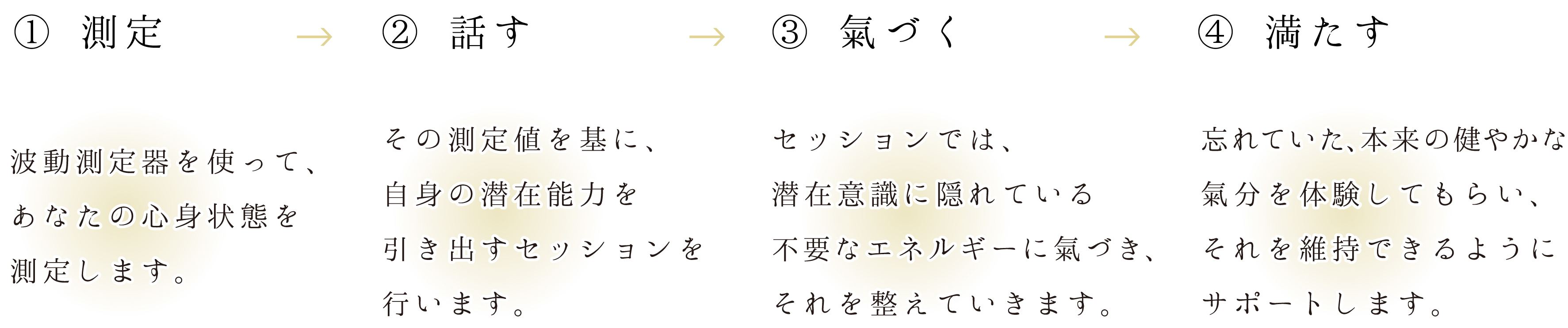 このセラピーでは、波動測定器を使って、あなたの不調や心の悩みを数値化・可視化します。そして、その結果に基づき、あなたの潜在能力を、最大限に引き出すセッションを行います。